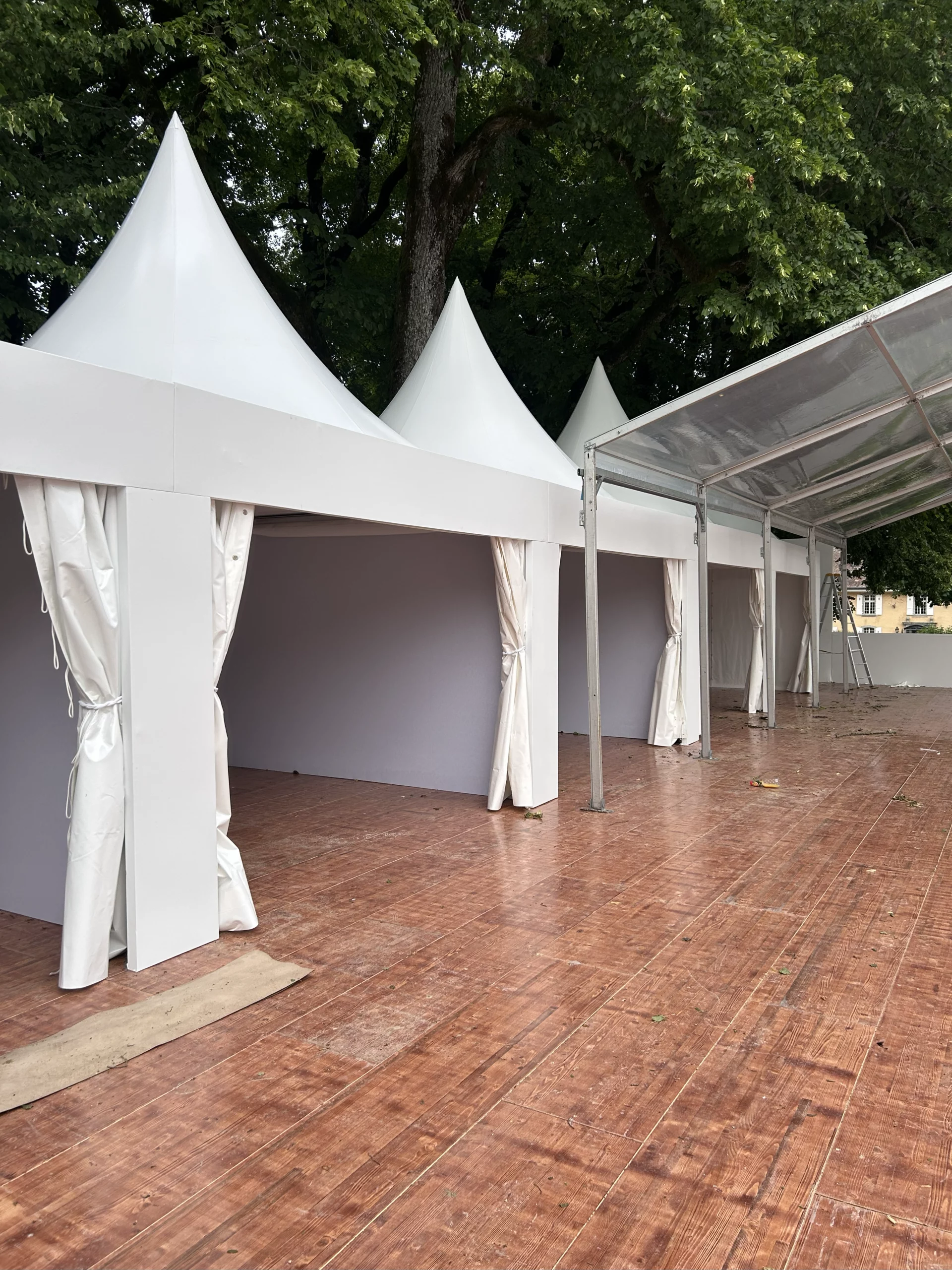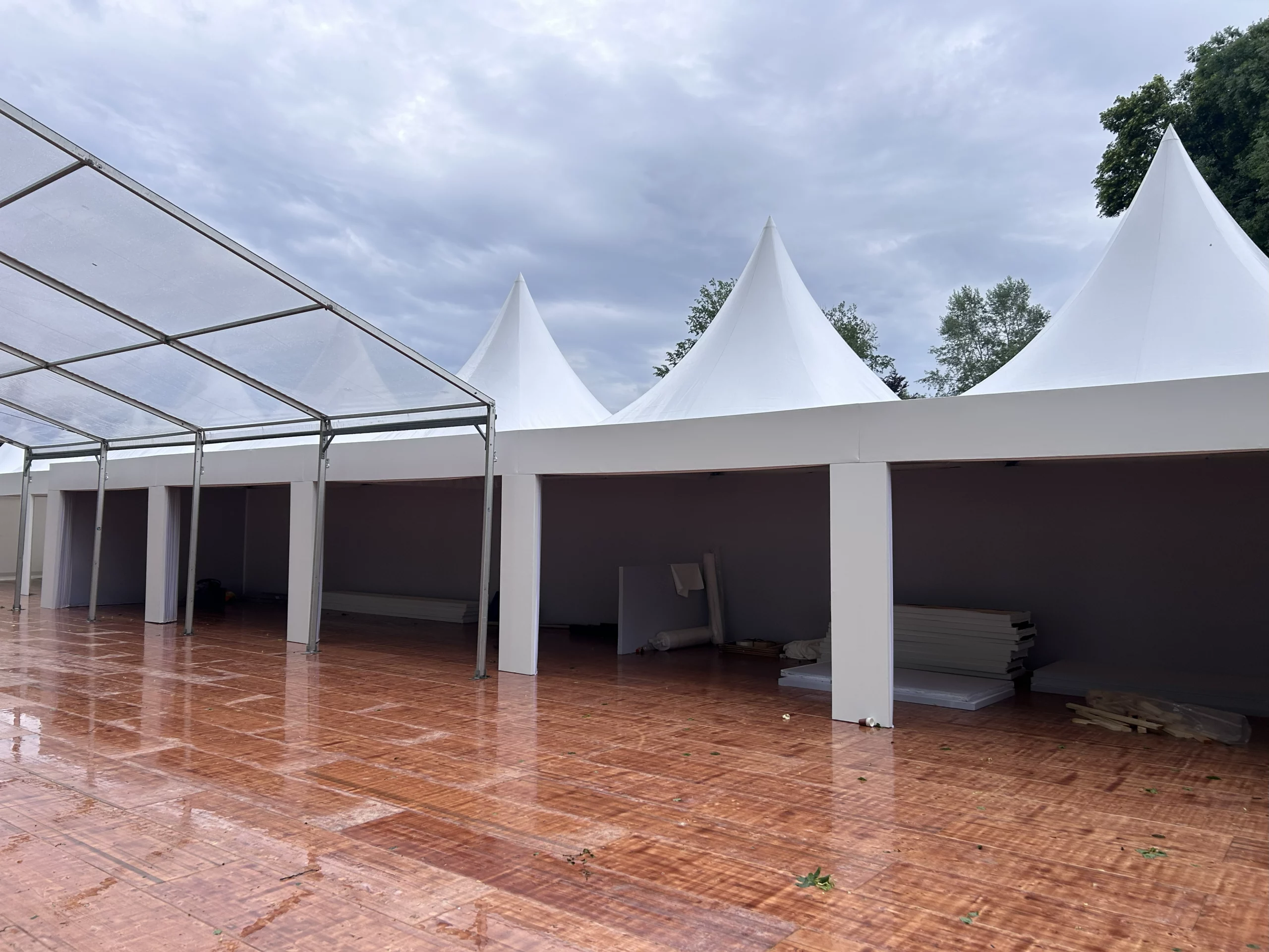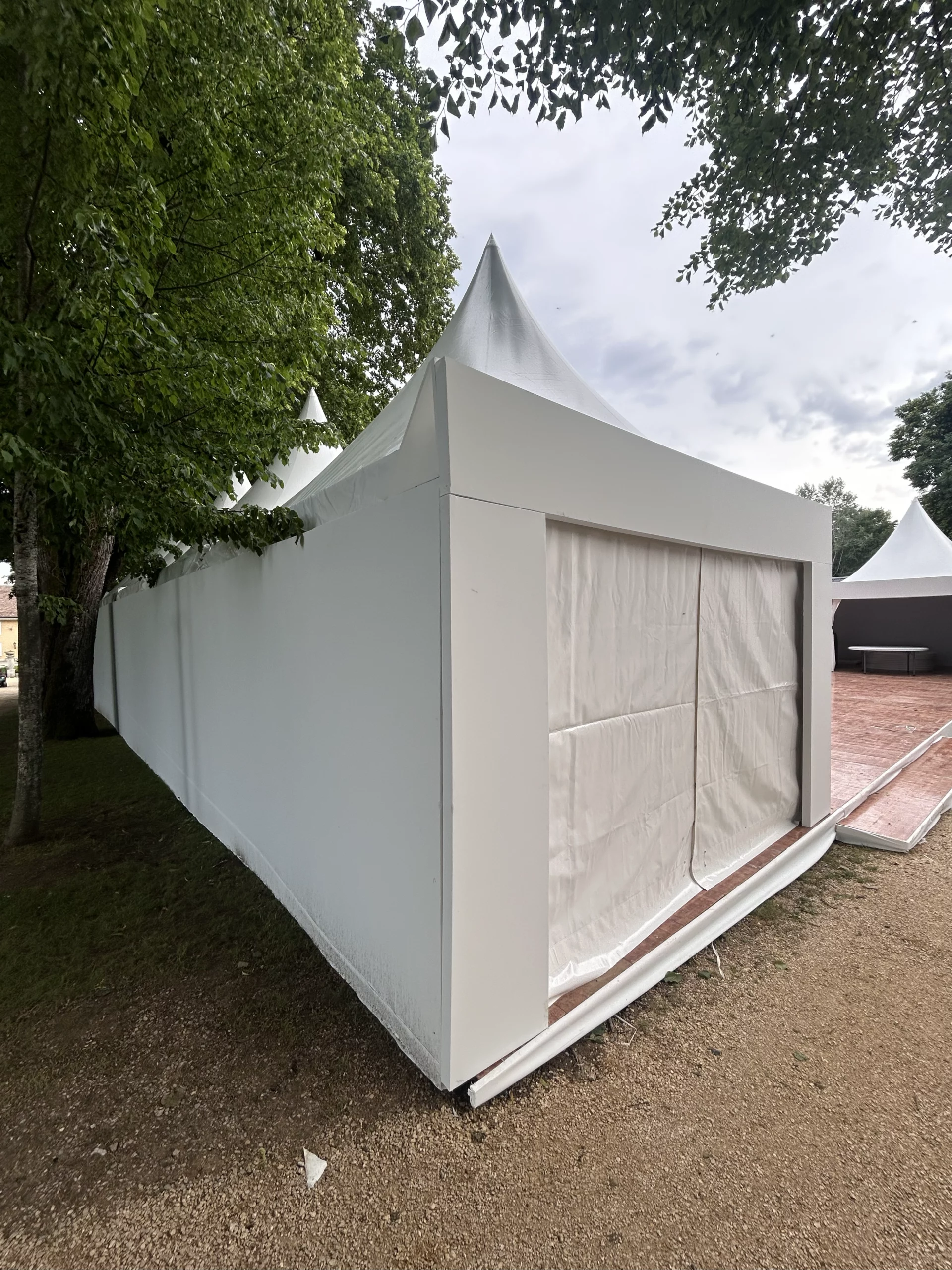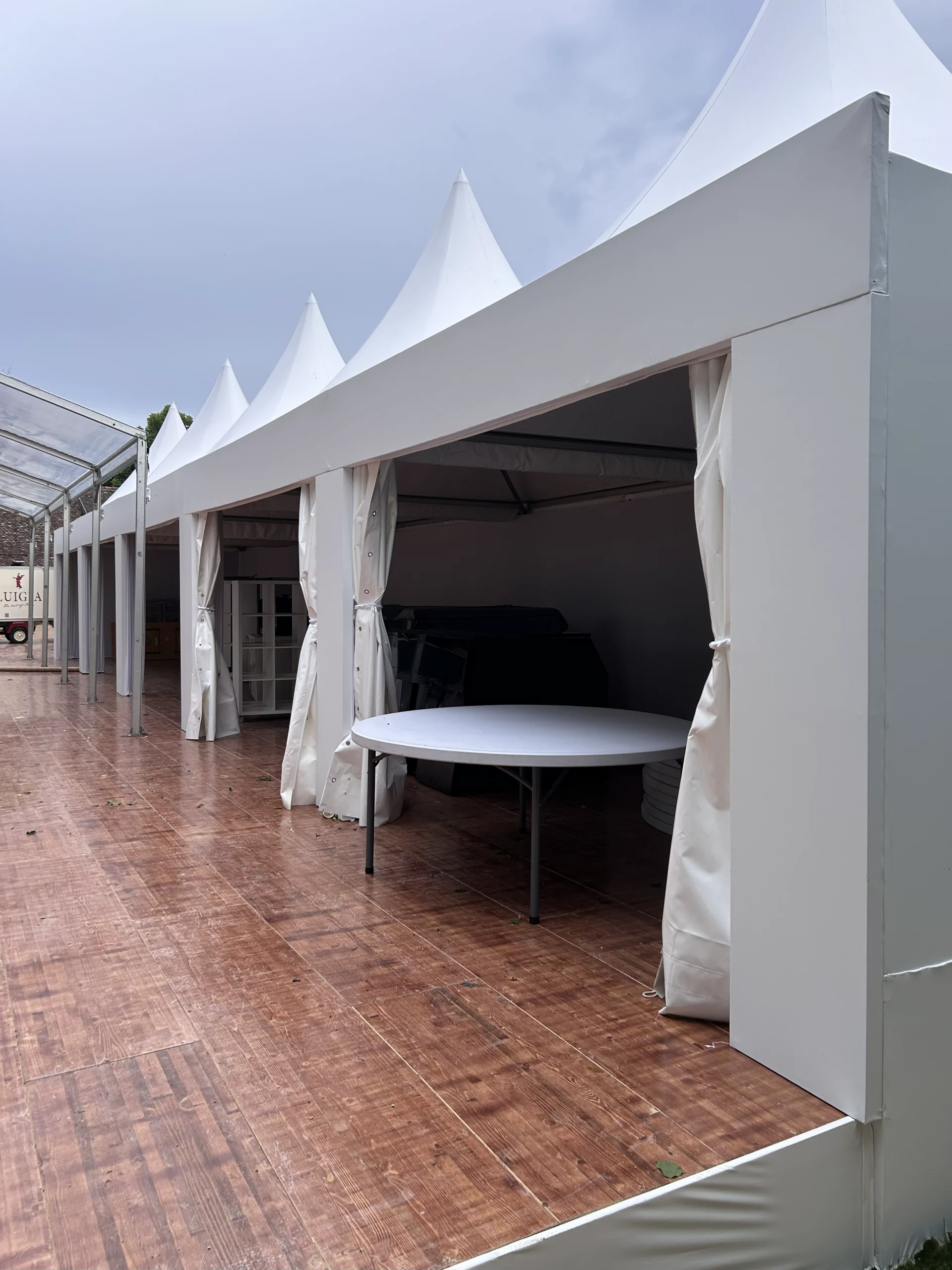 Nos équipes ont fabriqué des châssis en bois sur mesure pour structurer plusieurs zones clés : le restaurant, le couloir principal et l’espace VIP. Nous avons également assuré l’aménagement d’une tente ainsi que l’habillage des gradins spectateurs, pour un rendu harmonieux et professionnel.