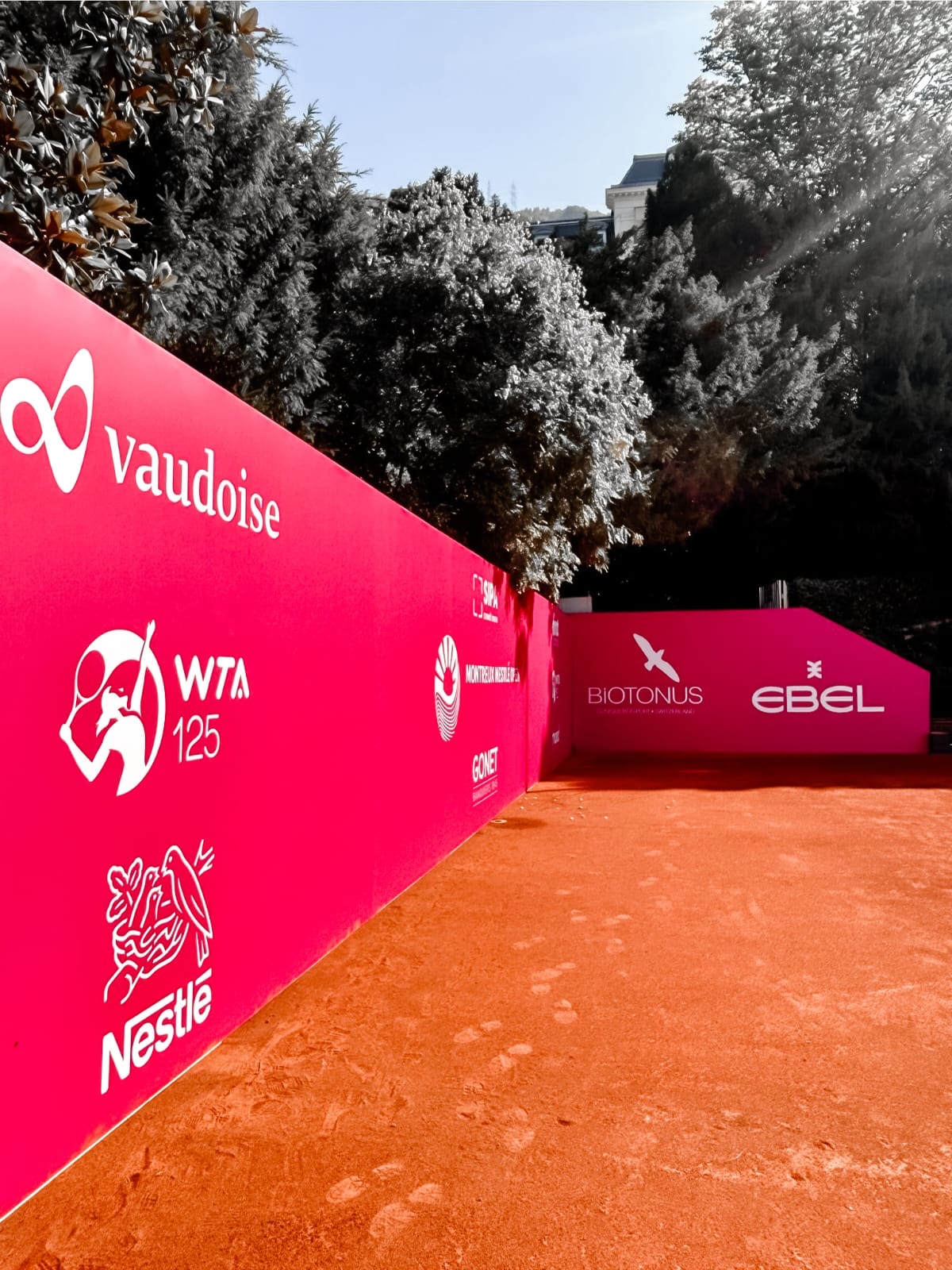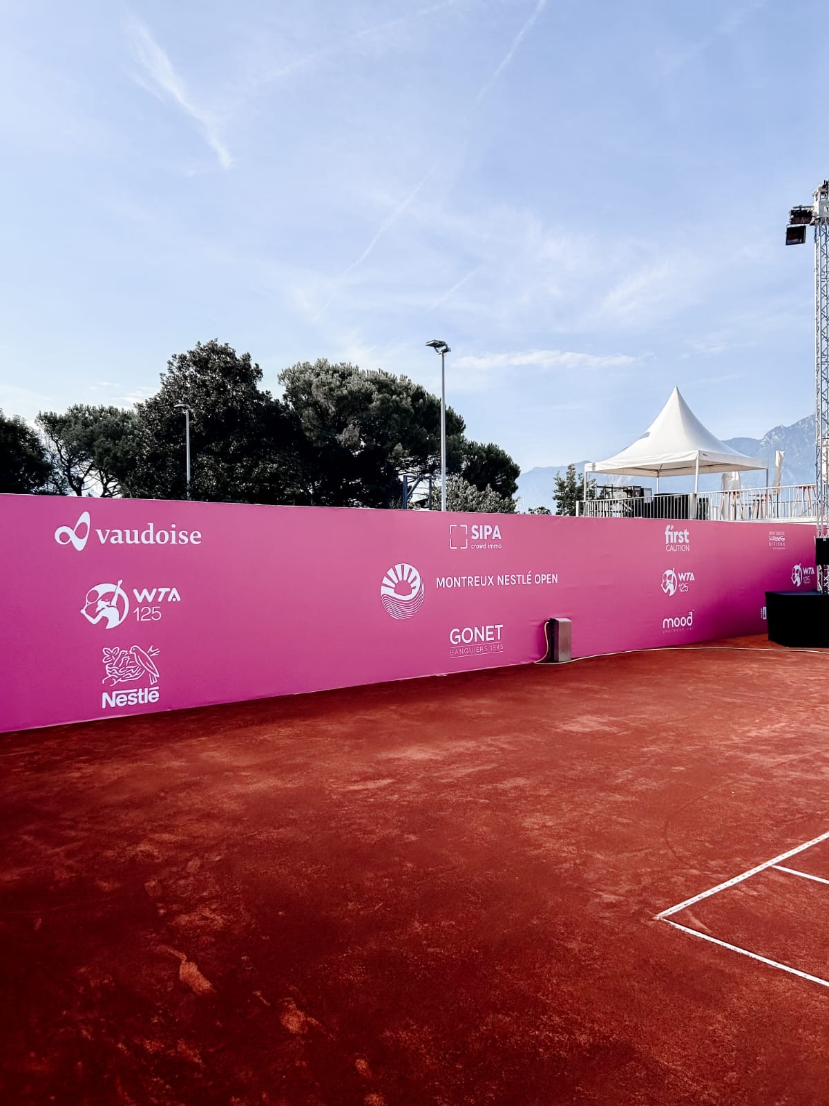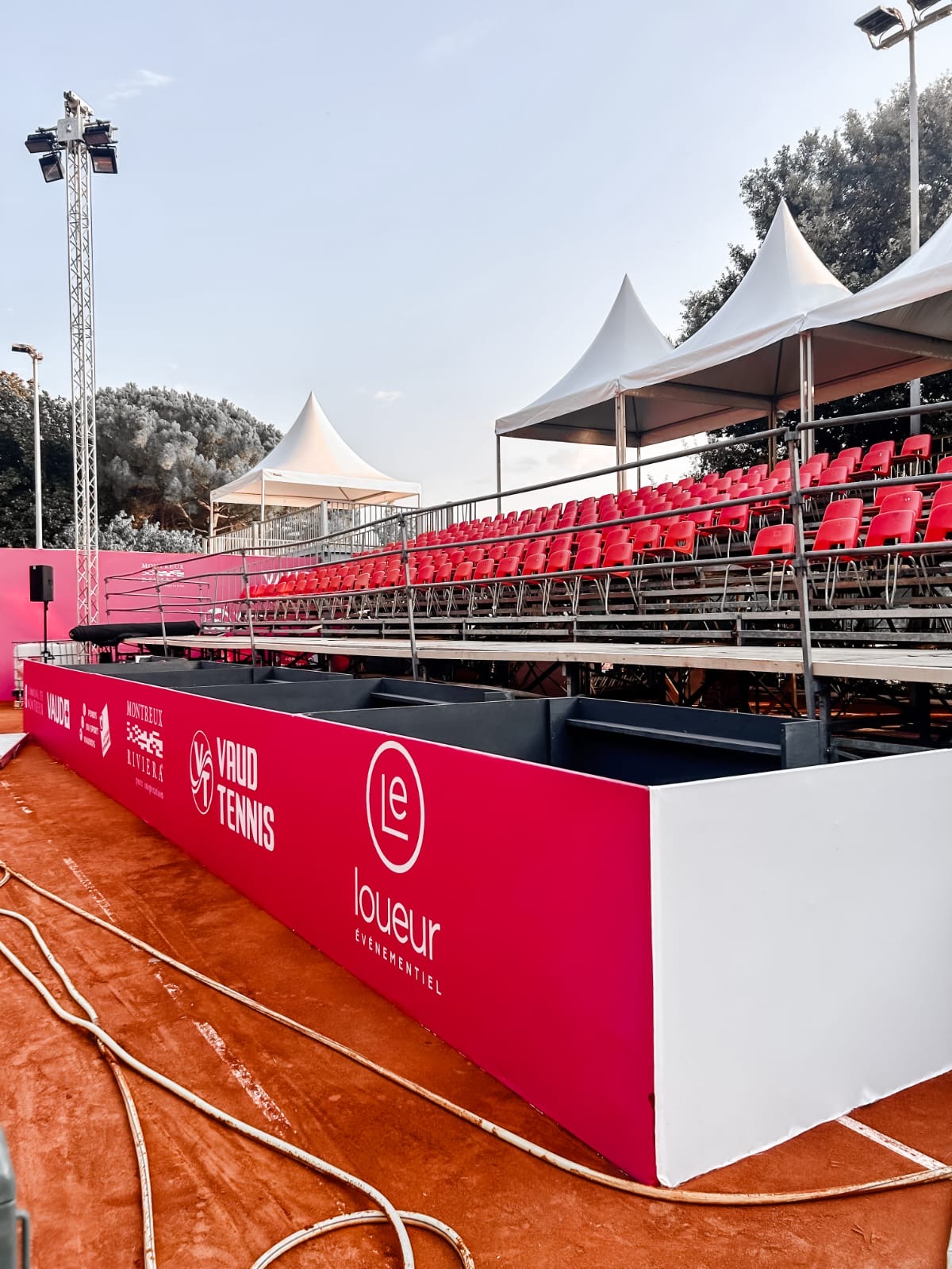 Installation de châssis en bois pour la pose de bâches sur toute la surface du terrain de tennis en vue de l’accueil de la WTA 2024, ainsi que la création d’une zone VIP.